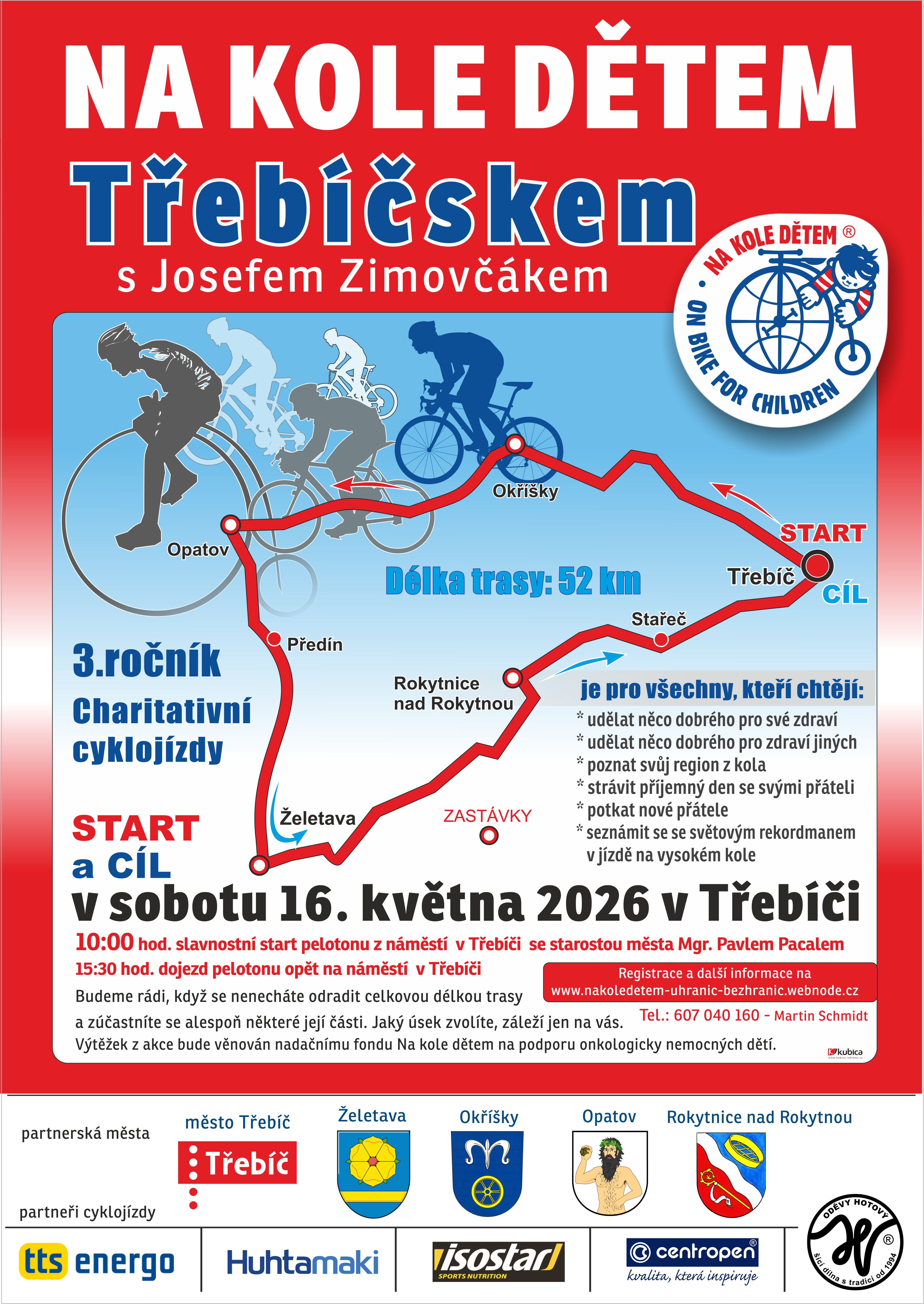 Zveme všechny cyklisty, rodiny s dětmi i nadšence do pohybu na 3. ročník charitativní cyklojízdy Třebíčskem, která se koná pod záštitou Josefa Zimovčáka, světového rekordmana v jízdě na vysokém kole.