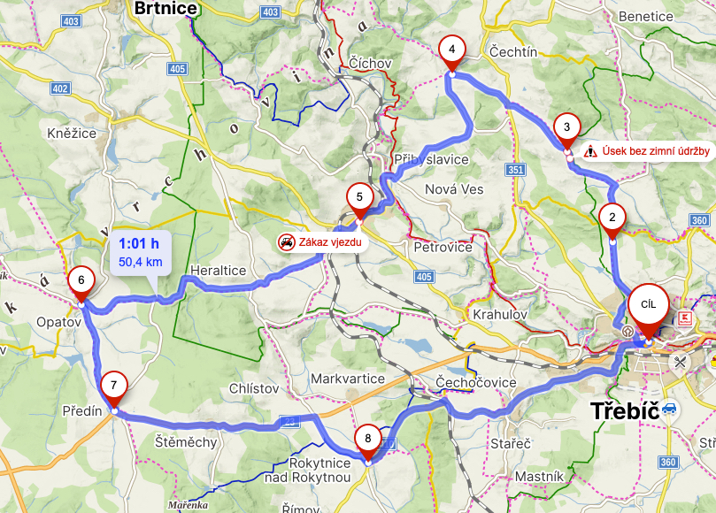 - Zastávky na trase: Třebíč (start) – Okříšky – Opatov – Předín – Želetava – Rokytnice nad Rokytnou – Stařeč – Třebíč (cíl).